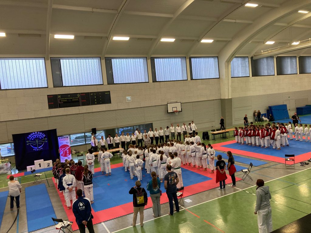 Bei der musikalischen Begrüßung wurden die 10 teilnehmenden Dojos genannt. Ich war überrascht, es gab 3 Kampfflächen mit 5 Schiedsrichtern und 4 Listenschreibern. Alle 3 Kampfflächen waren mit Matten ausgelegt und rechts sowie links lagen blaue Matten, auf denen sollten wir warten, wenn wir nicht dran waren.