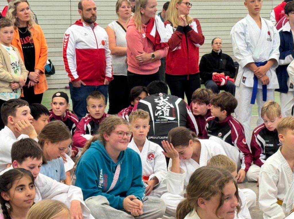 Das Catering war super organisiert und es war für jeden der 150 Teilnehmer etwas dabei. Es gab zu kleinen Preisen neben Käse-und Wurstbrötchen, verschiedene Salate aus Brokkoli, Couscous und Nudeln, warme Wiener sowie eine sehr leckere Süßkartoffelsuppe, jede Menge gebackenen Kuchen und Plätzchen, Obst sowie Getränke. Spannend fand ich, das auch hier abwechselnd ständig 7 Eltern vom Dojo unterstützten. Sobald etwas zur Neige ging, wurde aufgefüllt. Brötchen wurden nachgeschmiert, Wiener erwärmt … lange Wartezeiten oder -Schlangen Fehlanzeige. Was für ein gelebter Vereinseinsatz!!