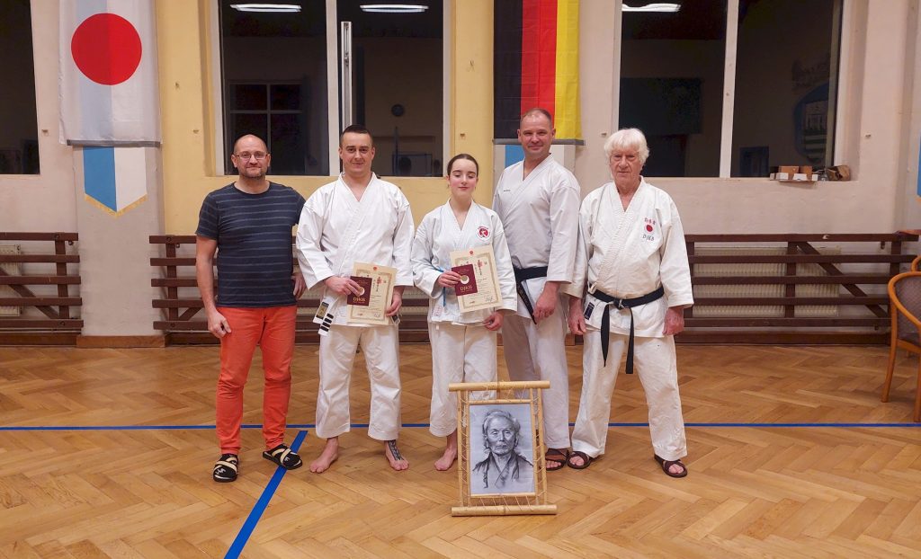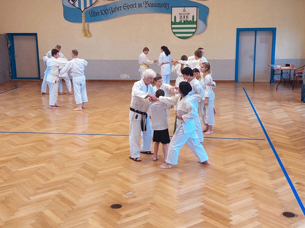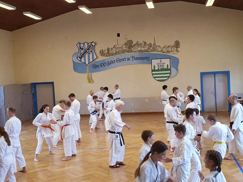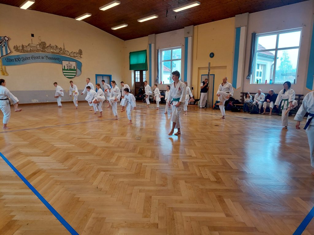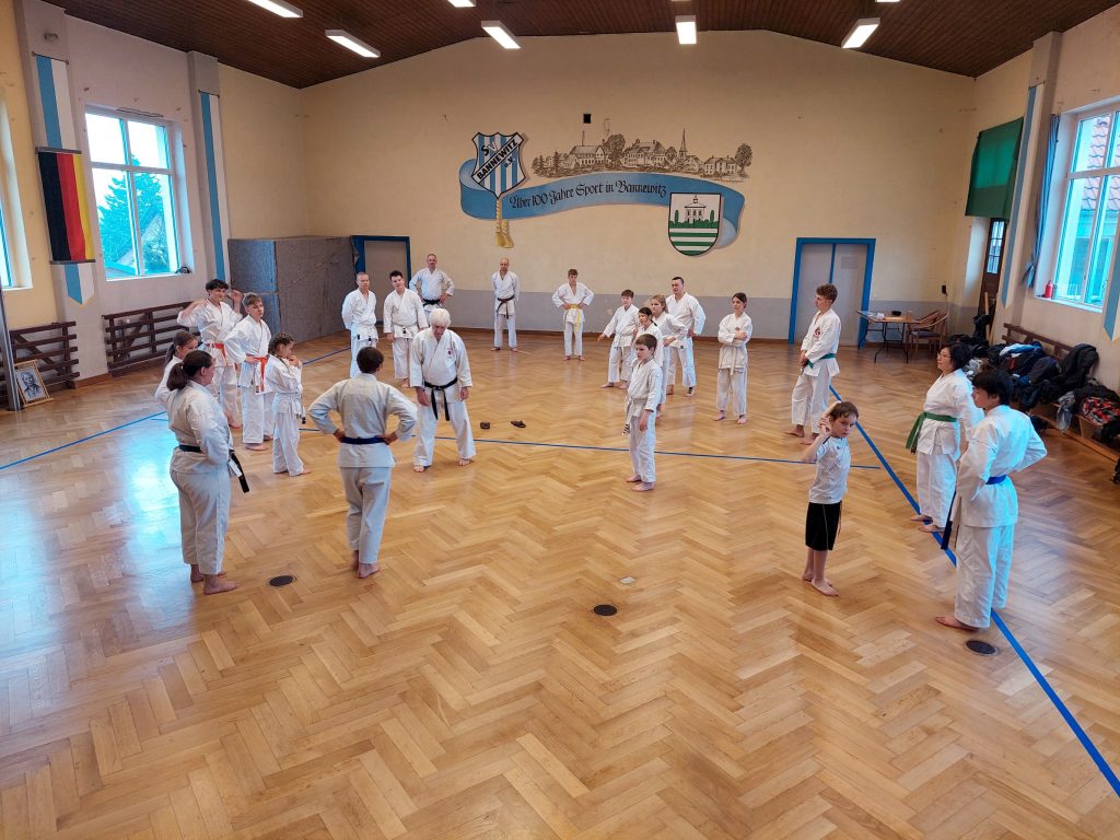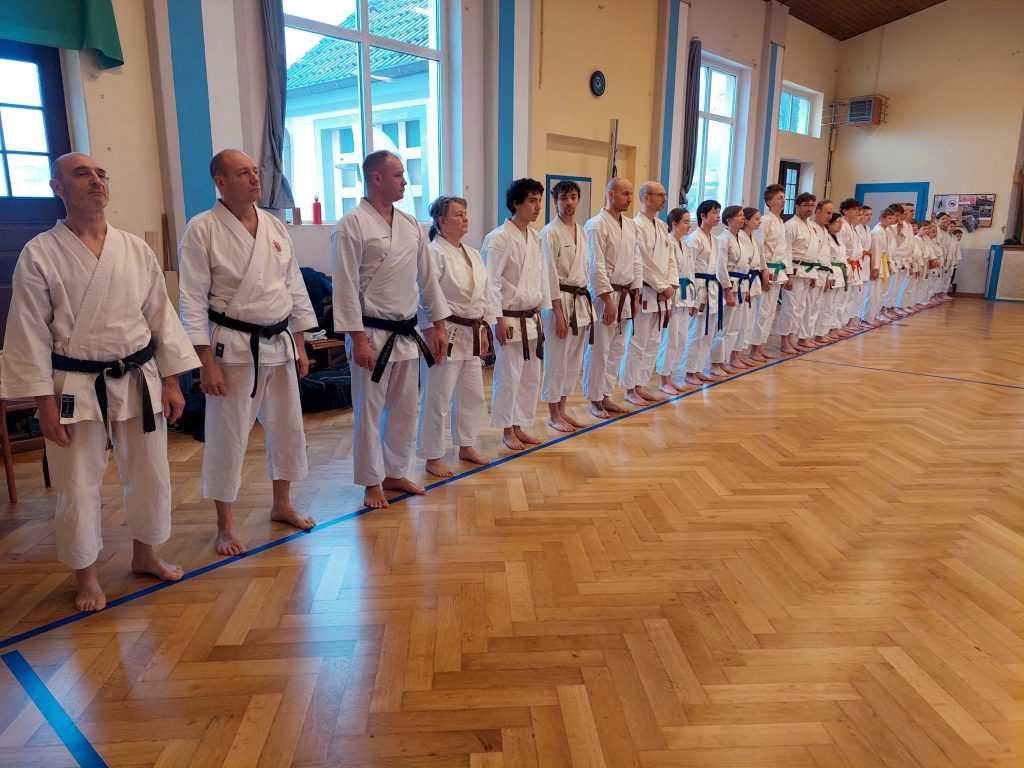 Wie immer fanden in der Woche vor dem Lehrgang unsere dojointernen Strichprüfungen statt, und am Lehrgangstag stellten sich zwei unserer Schüler der Kyuprüfung bei Sensei Axel. Erstmals hatten wir einen externen Beisitzer, was den Druck auf die beiden Prüflinge nochmals etwas erhöht haben dürfte.