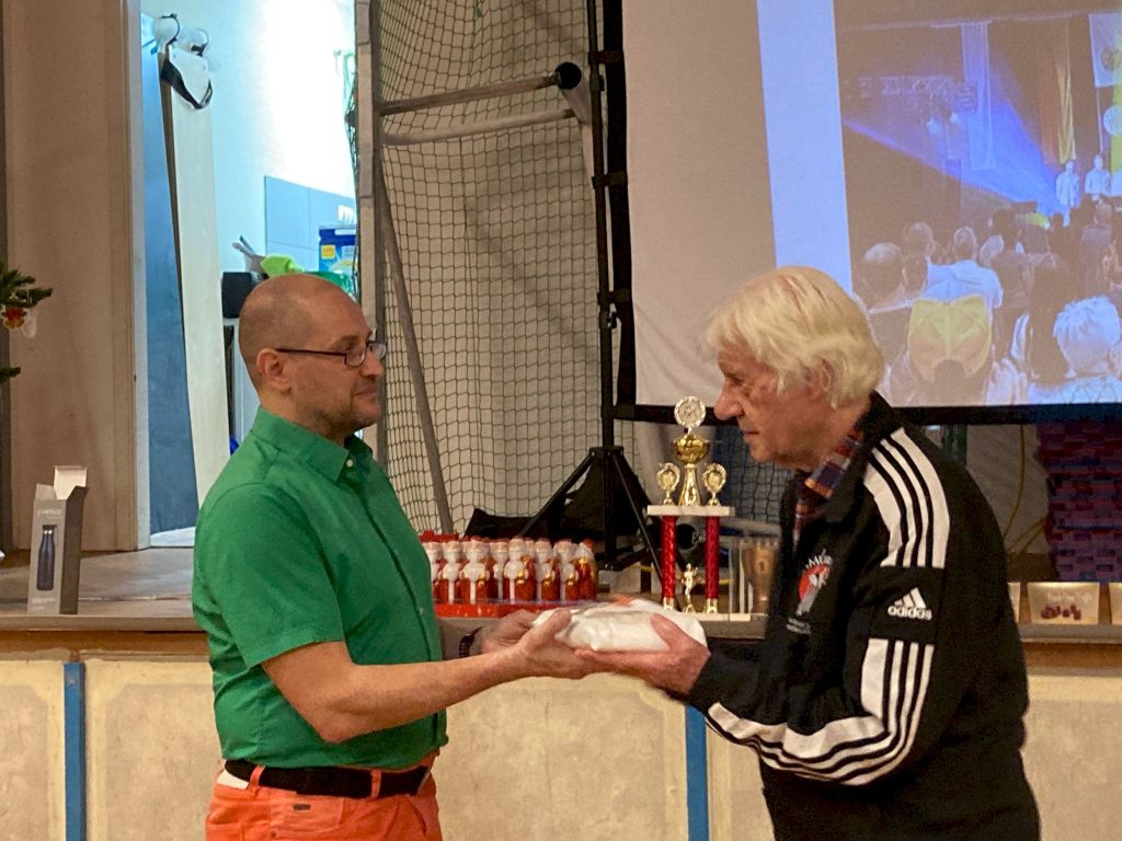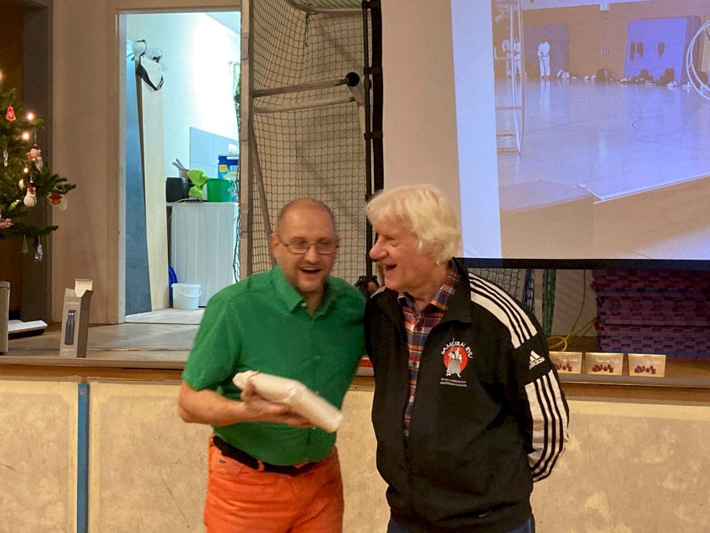 Dann erhielten alle Trainer ein Dankeschön für ihr Engagement in unserem Dōjō. Zudem wurde wie jedes Jahr der Wanderpokal weitergegeben und fand nun endlich einen neuen Platz bei Isabell. Überraschenderweise habe ich auch einen kleinen Pokal für meine wöchentliche Anwesenheit beim Training in der Gruppe 1 erhalten.