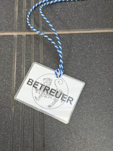 Am Eingang erkannten sie mich an der Dojo-Kleidung und begrüßten mich mit „Servus Oskar“.  Ich war der einzige Karateka von unserem Dojo. Sie kannten deshalb schon meinen Namen, sagten sie meiner Mum auf Nachfrage 😃. Sie erklärten uns, wo ich mich umkleiden kann und meine Mum bekam einen Betreuer Ausweis. Nur Betreuer durften in die Turnhalle, Besucher saßen auf der Tribüne.