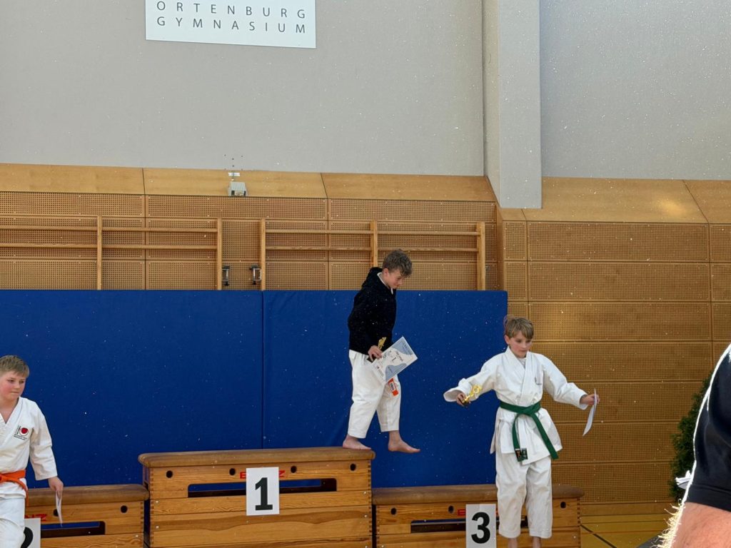 Die Siegerehrung dauerte gefühlt ewig. Als ich meinen Namen hörte, freute ich mich sehr. Ich hatte es tatsächlich geschafft. Ich fahre mit einem Pokal nach Hause, wie ich es mir vorgestellt hatte. Als ich dann das zweite Mal auf das Podest stieg und nochmals Oberpfalzmeister wurde, brüllten mehrere Leute meinen Namen und klatschten wild. Meine Mum erklärte mir hinterher, sie hat mit denen geredet und erzählt ich bin der Einzige aus unserem Dojo. Ich tat denen etwas leid, deshalb machten sie soviel Stimmung. Das fand ich total toll von denen!