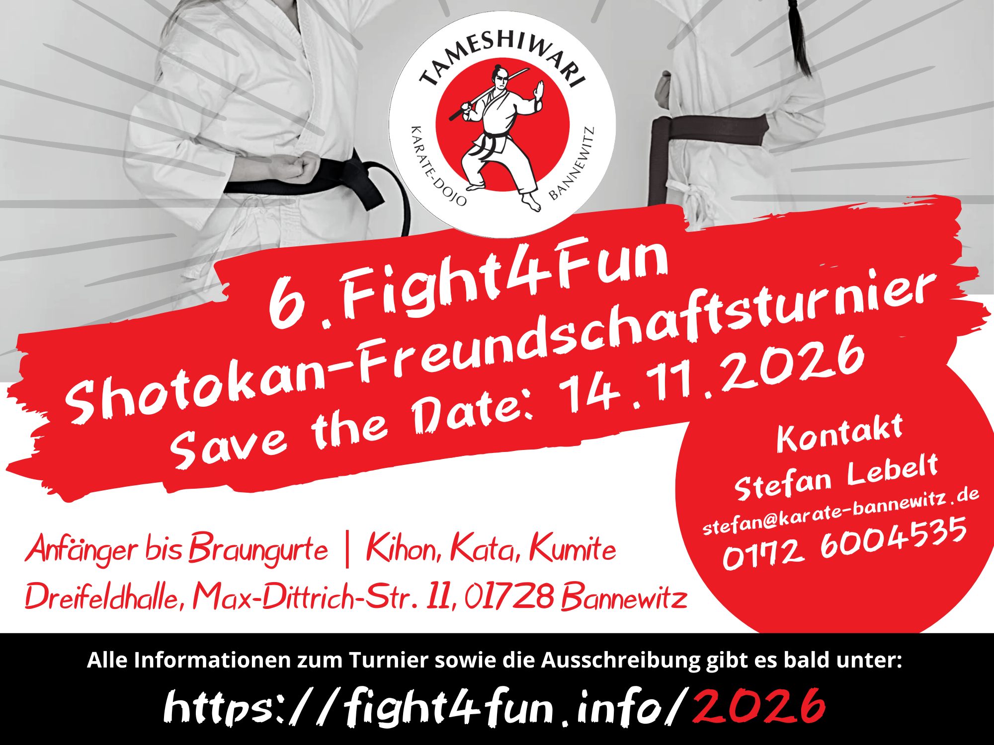 Für die Kampfrichter des diesjährigen Turniers findet am 30.10.2025 um 18:30 Uhr im Dojo Tameshiwari eine Kampfrichterschulung statt, die explizit für auf das Fight4Fun-Turnier ausgerichtet ist und insbesondere für Kampfrichterneulinge und Kampfrichter aus anderen Verbänden interessant sein dürfte. Interessierte sind herzlich eingeladen. Bitte gebt uns kurz Bescheid, wenn Ihr teilnehmen möchtet.